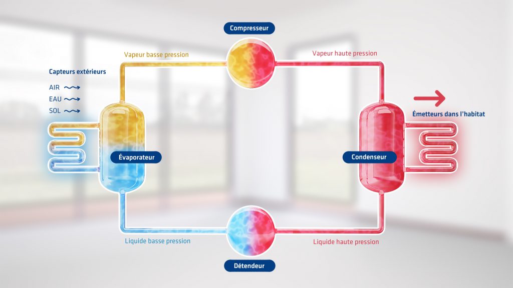 L’objectif d’une pompe à chaleur est un dispositif pour apporter une énergie propre, gratuite et renouvelable dans un ménage tout en puisant son énergie dans l’environnement. Son principe est de capter la chaleur extérieure à partir de l’air, de l’eau ou du sol pour ainsi la transformer à une température suffisamment élevée pour chauffer l’habitat.La pac doit être dotée d’un certain nombre d’éléments pour pouvoir capter et restituer de l’énergie.